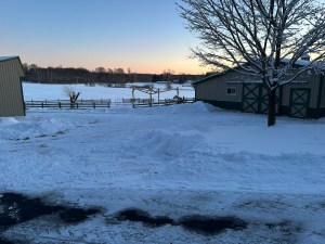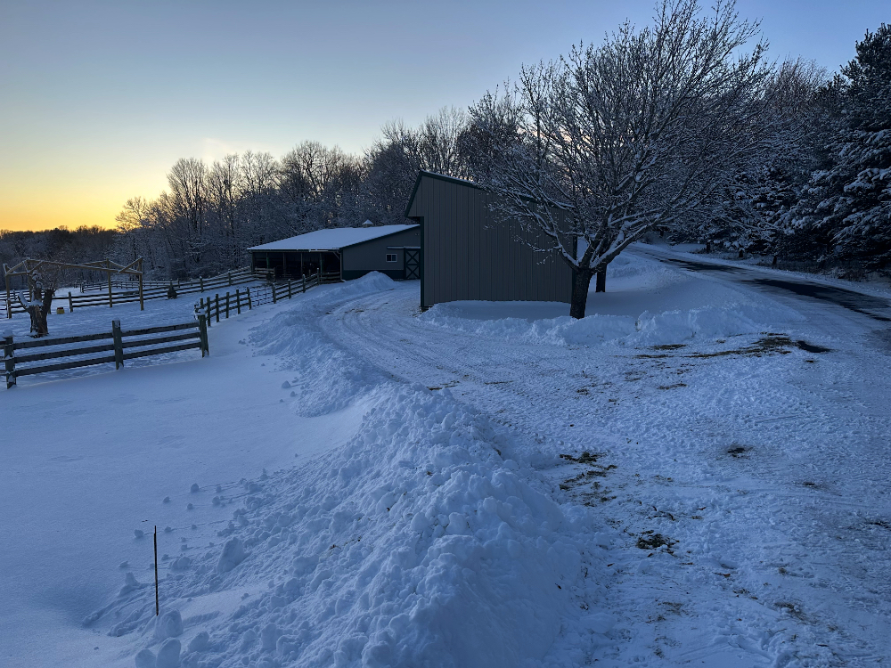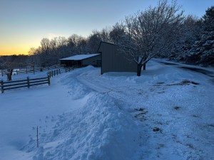 Having made that run up and down the driveway in the middle of the storm Sunday night made yesterday’s work much easier. I ended up spending a lot of time trying to plow around the barn and hay shed because I hadn’t touched that on Sunday, so it was the full depth, and the base level was still a little wet and messy.