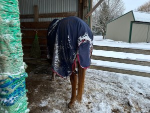 A few days ago, we were putting rain sheets on the horses before the weather switched over to snow and made a mess of things. Cyndie had to battle hours of driving in the miserable conditions, and the horses have been clomping around in a mix of freezing and thawing slop ever since.