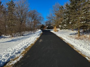 Beyond that space where the snow remains are the tracks I made with multiple passes on the ATV. Instead of plowing over the gravel, I just drove back and forth a few times.