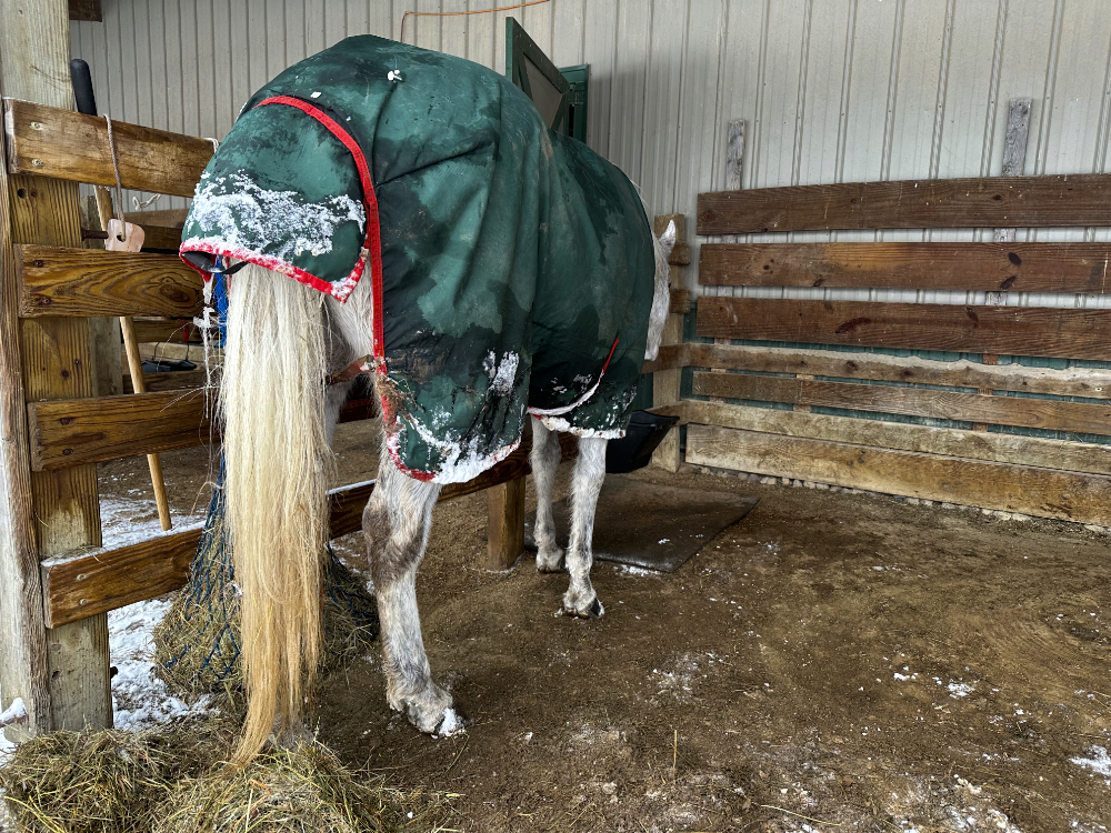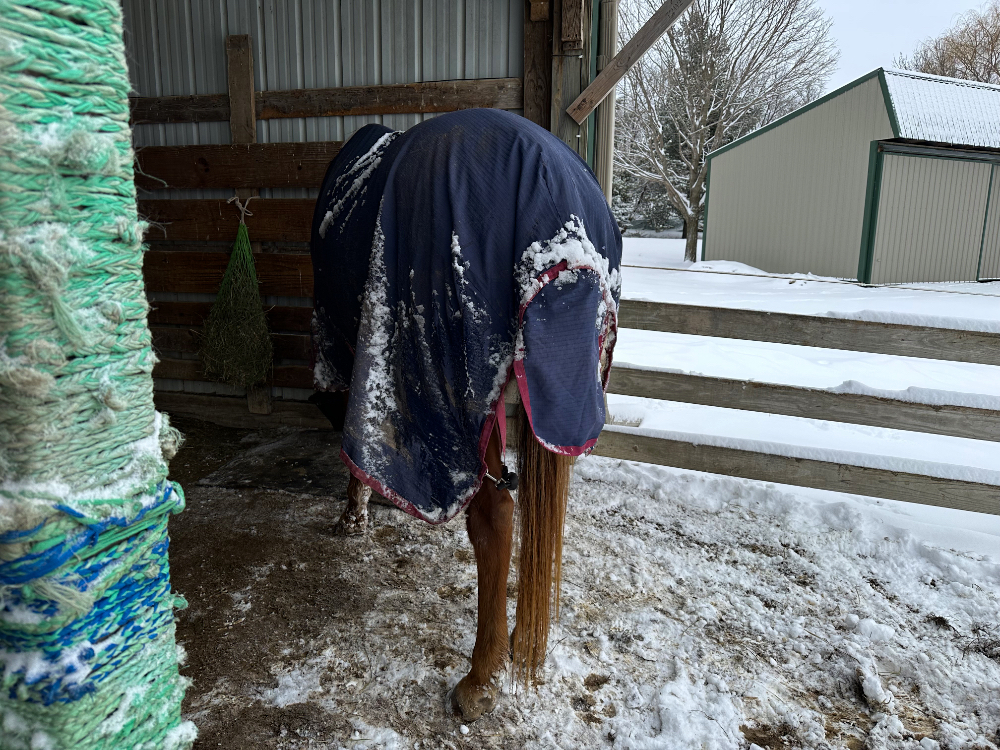 A few days ago, we were putting rain sheets on the horses before the weather switched over to snow and made a mess of things. Cyndie had to battle hours of driving in the miserable conditions, and the horses have been clomping around in a mix of freezing and thawing slop ever since.