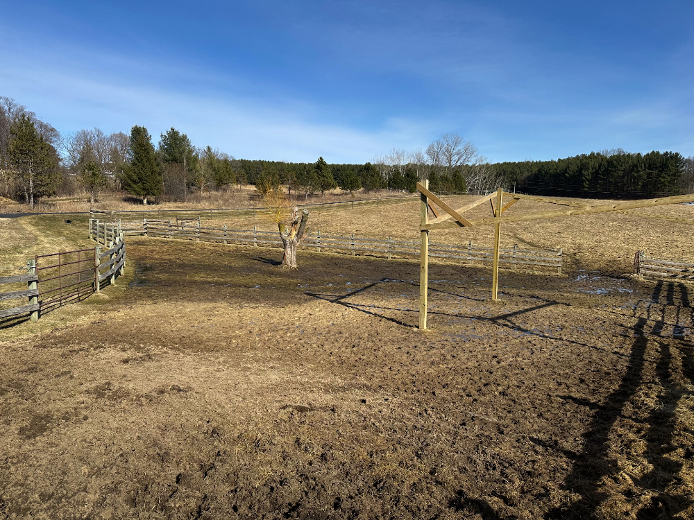 The surface dries in a gradient, but not entirely linearly. Partway down the slope tends to dry the fastest, while the area uphill from there, just beyond the barn overhang, stays muddy a little longer. Just this side of the chopped willow tree that can’t figure out how to completely die, stays wet the longest. That water needs to travel from around the driveway loop all the way across that paddock to get to the drainage swale crossing our property from north to south.