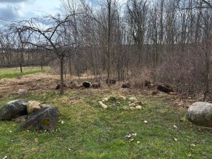 I pruned the weeping crabapple tree, contemplating the odds that it will be flowering in all its glory during the first weekend of May. The log stools around the fire pit had rotted to the point of disintegration. I toppled them and rolled the pieces into the brush beyond.