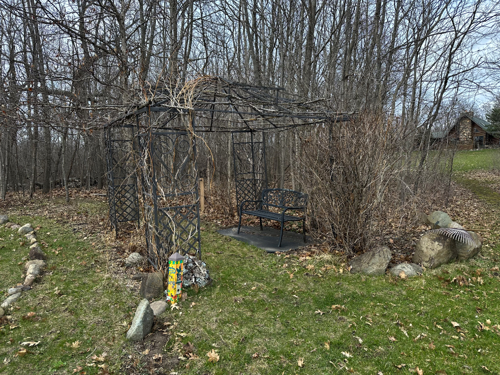 World Labyrinth Day is only three weeks away, and we would like things to look their best, despite this being way too early in the growing season for plantings to look healthy. The vines climbing the gazebo look rather skeletal.