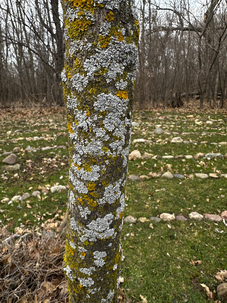 It has come time to deal with the dead maple transplant at the center of the labyrinth. The young trunk has developed a nice covering of lichens that accentuate the fact that it is no longer living.