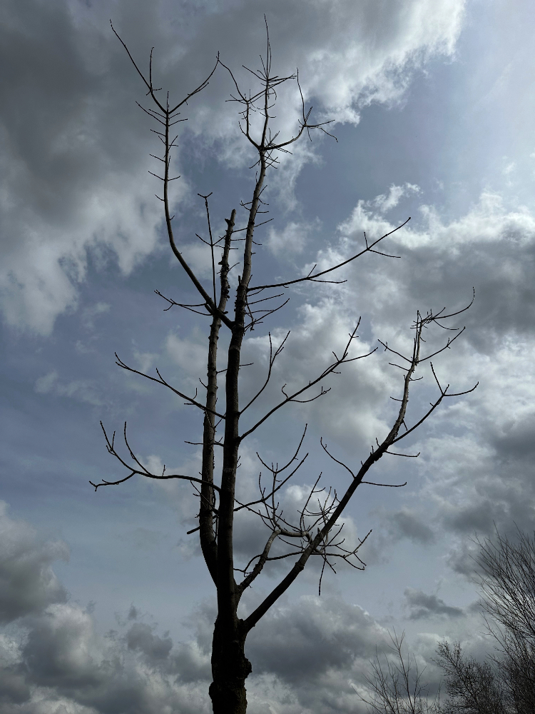 I wrapped my hand around the trunk and pushed and pulled to see how much it would sway. The saturated ground made it sound like the roots were moving in standing water. Not having a saw with me at the moment, the tree stands for another day. One of the upper branches has already snapped off. I found it scattered on the ground below about a month ago.