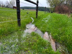 When the appointed hour for feeding horses in the afternoon arrived, there was a pause in the precipitation, and Asher and I took advantage of that to first walk through the woods and around the fields. The trails were like flowing rivers. Water in the drainage swale along the south border of our property was overflowing its eroded ruts.