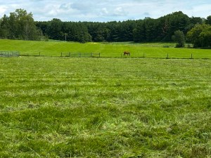 I had closed the gates to keep the horses out of the back pasture, but they were free to graze in the recently mowed hay field. I always love seeing them out on the grass instead of standing in a stupor under the overhang, which tends to be their preference much of the time. That’s Mia all by herself in the image.