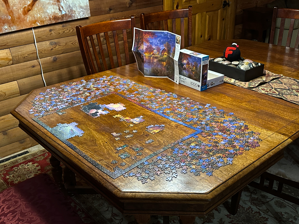 When we weren’t outside enjoying walks in the perfect falling snow, Barb and I ripped through a 300-piece jigsaw puzzle, while Cyndie made short work of a cribbage match with Mike. We played a couple of other games, listened to an episode of the Telepathy Tapes podcast, and watched a movie that was wrongly identified as a “comedy.”