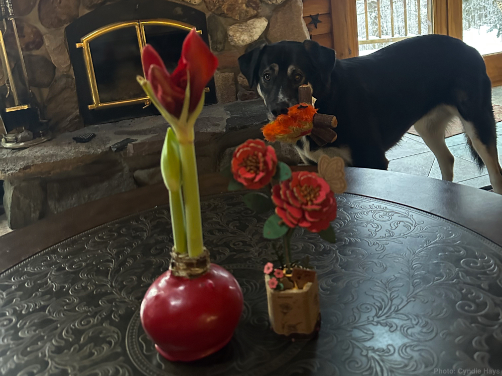 Cyndie took a picture of Asher with his squeaky/krinkly campfire chew toy in his mouth, standing beyond her red waxed Amaryllis bulb and her wooden roses puzzle, which Elysa helped her assemble the previous weekend.