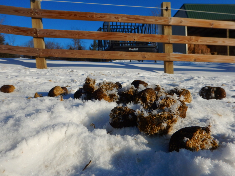 So, I’m hoping to make it as easy as possible for our animal sitters to maintain some semblance of cleanliness in the paddocks. It is not easy to pick up manure that first melts, and then re-freezes into the frozen snow and ice packed on the ground everyday. After the struggle to get it up, hauling it to the compost pile is another battle. I have started to create piles within the paddock where it can be temporarily stored.