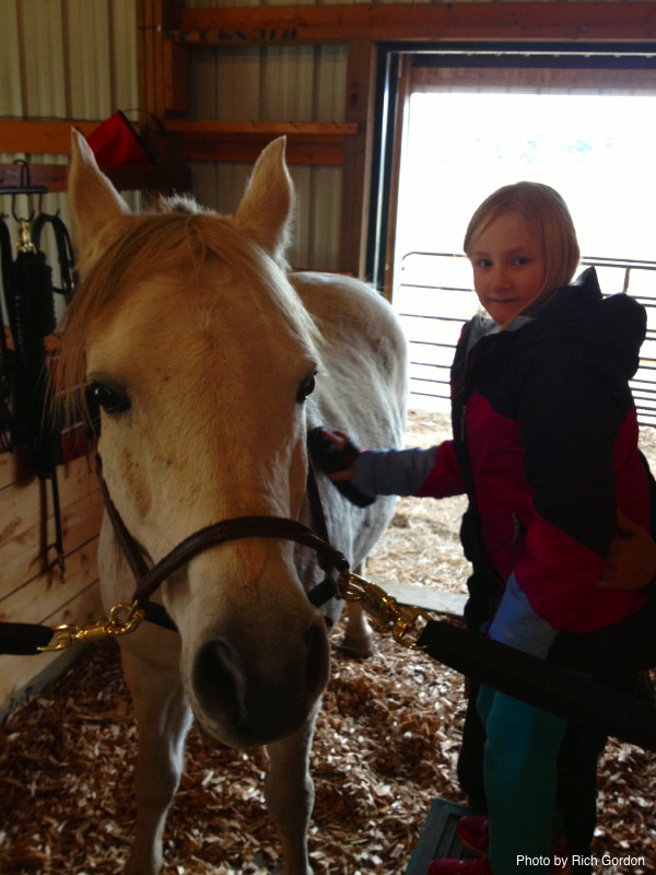 Cyndie brought Legacy into the barn to be groomed, and Sarah was able to help out with that task. I think she may have done too well, because when we returned to the barn later, to give the horses their afternoon feed, Legacy was covered with mud. He must have felt too clean, and rolled on the ground, in his version of self-grooming, to create a new layer of “insulation.” It was pretty funny to see.