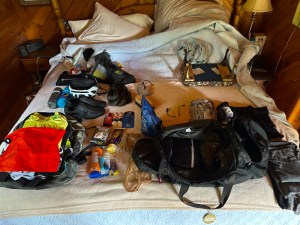I sent that picture to my biking partners on this adventure, Gary and Rich, and they questioned the upside-down footstool. Yeah, that’s not something I’m bringing. Cyndie was cleaning the floor around the bed while I was packing.