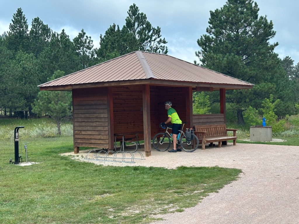 We are impressed with the quality of this trail and the attention to detail in their trail stops. They are nicely spread out and offer shelter, seating, hand-pumped well water, bike tools stations, and pretty respectable toilet facilities.