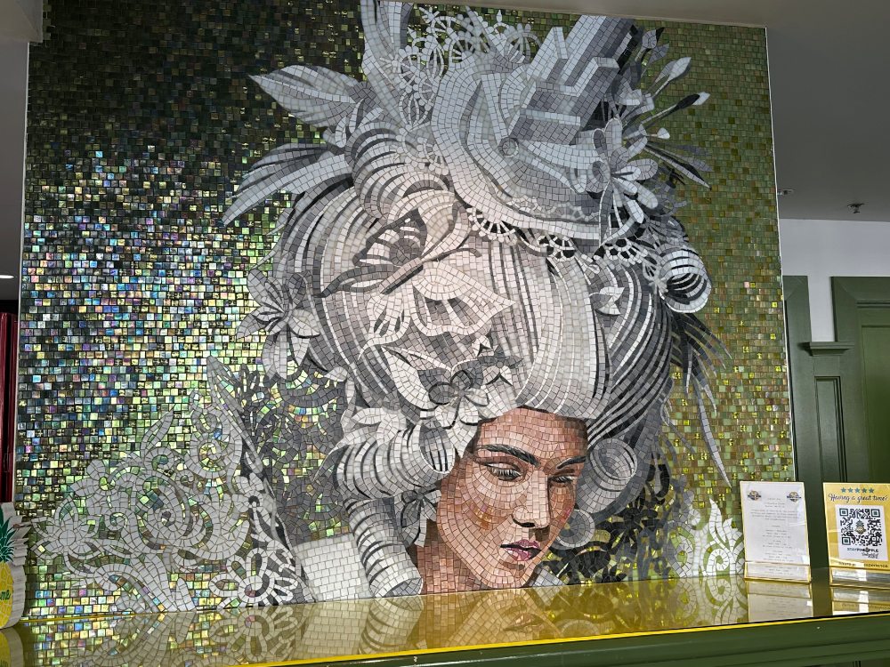 Early check-in was available at the Stay Pineapple for the room we reserved for Barb and Mike, so we walked with their luggage to get a look at their room. I was captivated by the whimsical dog sculpture and the tile mosaic in the foyer.