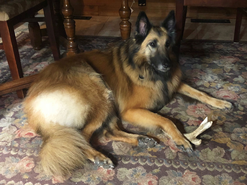 Later, I glanced at our beautiful Tervuren under the old Hays family table and caught her paw draped over the antler chew she found in the woods.