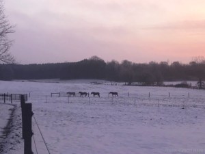 Yesterday morning, Cyndie captured this wonderful moment as our four Arabians made their way along the fence line of the hay-field back toward the barn in the enticing soft light before sunrise.