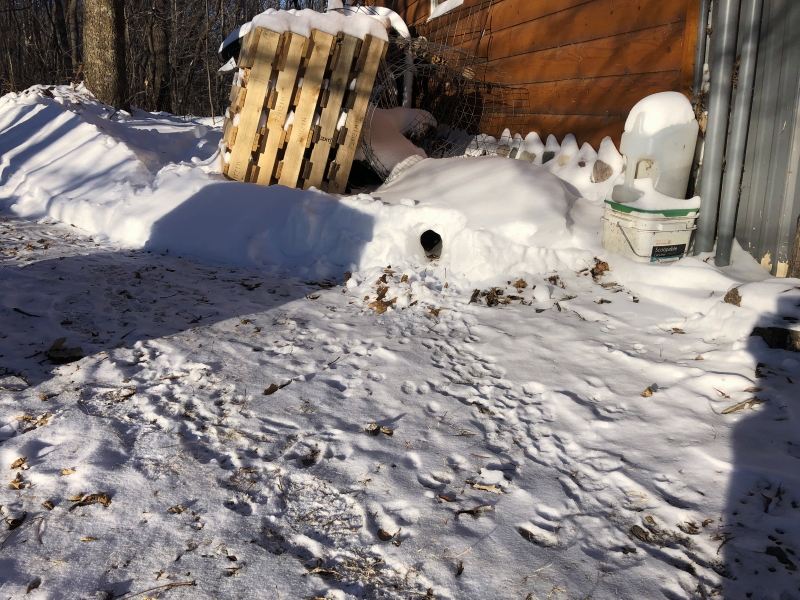 It appears the wild rabbits in our vicinity are using activity to keep warm, as their footprints are pounding well-worn paths in the snow. I found a not-so-subtle entrance to a den dug into the snow beside the shop.