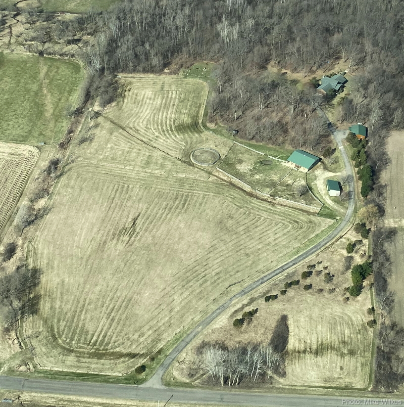 From the road at the bottom of the picture you see our driveway climb beside the big hay-field and turn at the hay-shed and barn, rise past the shop garage to the house at top. The paddocks and round pen are clearly visible, as is the labyrinth tucked in trees above the upper pasture that was also cut for hay last year.