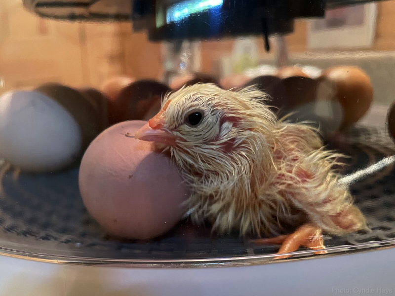 The first beauty surprised us both by emerging just a couple of hours after Cyndie’s early morning audit revealed 9 out of 17 eggs had visible “pips” in the shells. That first chick was getting pretty lonely by 2:30 in the afternoon, which is when I arrived to witness chick number two emerge.