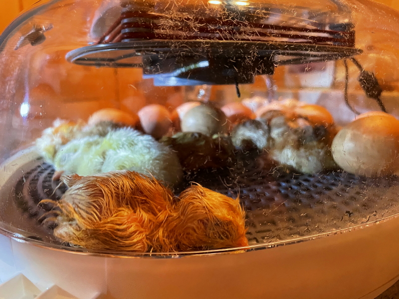 After they are out of the shell, they continue to abruptly crash into instant sleep, and from what we saw, it is highly contagious. It is fascinating to watch. Suddenly all nine of the hatched chicks would lay down as if dead for maybe twenty seconds. When one pops up, all the others take the cue and a sort of cage match chaos resumes, right up until they all fall down again less than a minute later.