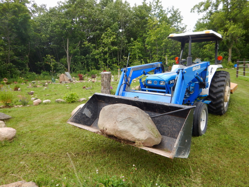 The first set of rocks I picked up were smaller than the one in this picture, so on a whim I decided to drive up and see if I could maneuver the tractor in place and roll one onto the waiting tree trunk.