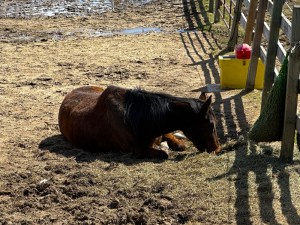 Rubbing against the posts is a much better option than against the hay nets that Mix was trying to use. The metal clips on the blanket were getting snagged in the netting while we were standing there, and unfortunately, they don’t rely on finesse to get themselves out of such situations.