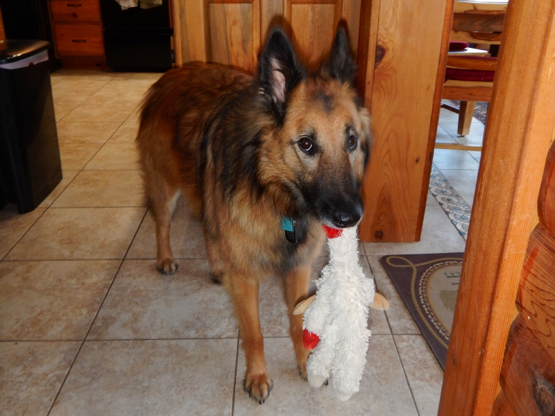 Later, I glanced at our beautiful Tervuren under the old Hays family table and caught her paw draped over the antler chew she found in the woods.