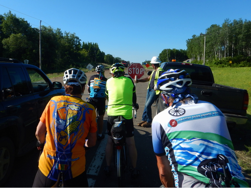 At one point we came upon a crew repaving the road. We simply joined the autos in waiting a turn to pass through the construction zone.