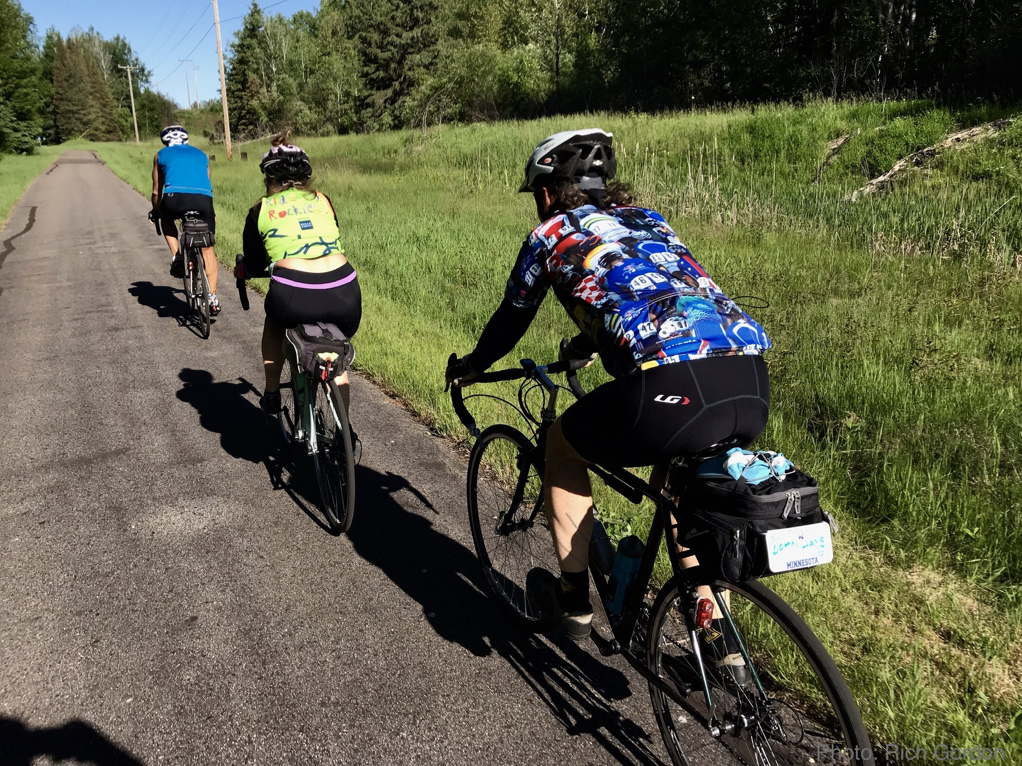 It was a beautifully sunny day out of Gilbert. Rich captured this shot of Steve leading Laura and me on a particularly bumpy section of the Mesabi trail.