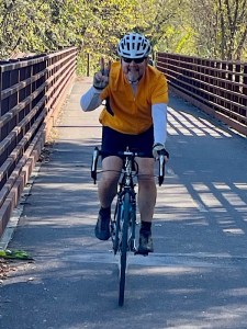 Rich captured a good shot of me sporting my pumpkin-orange, perfectly Octoberish cycling jersey.