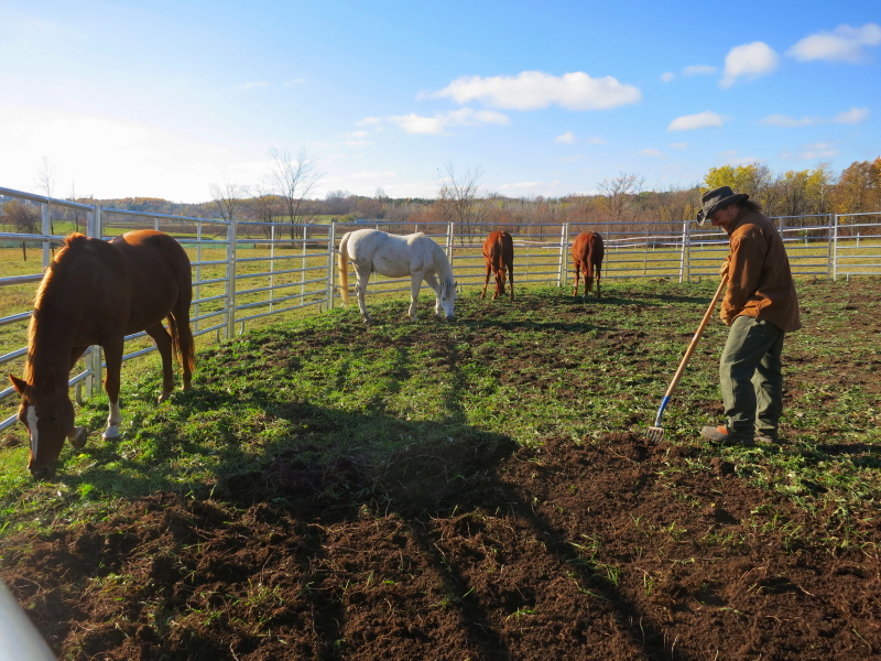 I needed to stop by the paddocks, because I had offered to bring in the wheelbarrow for Cyndie to harvest the latest crop of fertilizer. That’s when I noticed that Cyndie had included the gate to the round pen when she opened up the gates to grazing fields after she fed the horses earlier in the morning. While we have been busy with other things, the dirt of our round pen area has been getting overgrown with grass. They have been grazing the area around the pen, but the grass inside was untouched. Horses to the rescue!