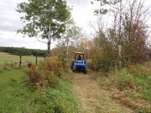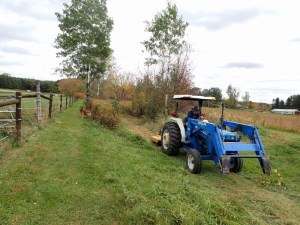 By riding first thing in the morning, so that I could get back to feed the horses at their usual hour, I still had the whole day open to take on whatever chore I wanted. The one that seemed to offer the greatest return for the effort involved cranking up the diesel New Holland with the brush cutter to knock down the uncut areas along the edges and corners of the hay field that the hay mower couldn’t negotiate.