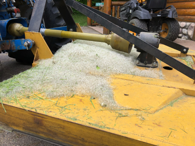 When I was all done mowing the back pasture I discovered a bumper crop of dandelion seeds had piled up on the brush cutter behind me.