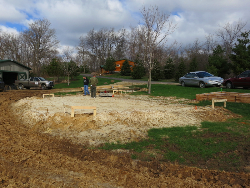 Yesterday, the crew showed up to begin the process of framing the hay shed. They didn’t get very far. Guess what. It’s too wet. Imagine that. At least they accomplished the first critical step of stringing up the exact square dimension of the future structure. After that, they drilled one hole with the skid loader, and quickly discovered they would not be able to set the posts yet.