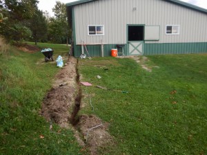 Despite the third consecutive day of abnormal heat for September, we braved the blazing sun to complete the trench to the barn. That was not an easy feat, because the last stretch crossed an area where we had laid down a lot of gravel for the driving path extending beyond the back of the barn.