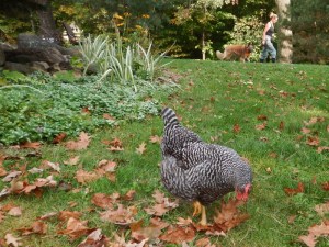 I turned back to warn Cyndie, because she was bringing Delilah out with her. Despite a recent occasion when I was distracted while holding the leash and Delilah jerked violently in an attempted chase after the chickens, Cyndie reports a series of well-behaved, closely supervised, successful passes between dog and chickens.