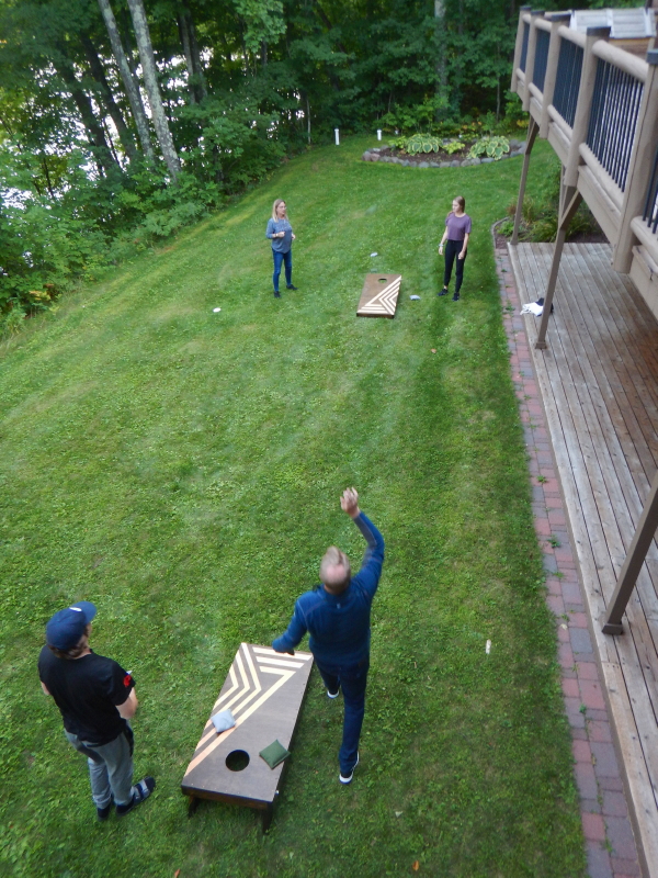 Julian and Allison also brought up custom-made cornhole boards that were a groomsman’s gift from a friend whose wedding Julian was in. With a fire in the firepit and pork chops on the grill, the bag toss game fit nicely as further entertainment up and out of the chilly lake.