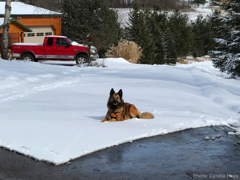 Delilah was granted some leash-free time to watch. I think the snow probably felt good on her sore spot. She makes for such a noble looking sentry, doesn’t she?