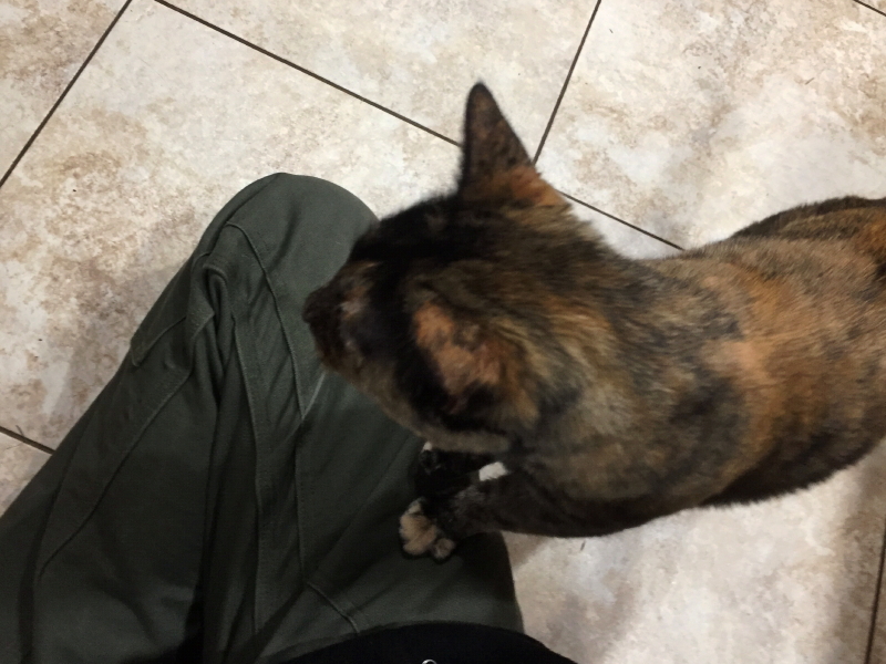 I didn’t intend to get tangled up in these secret little affairs with ‘Nita. These moments of intimacy came about because I got frustrated with her penchant for reaching up and burying her claws into my pant legs. When I don’t have on my canvas Carhartt jeans, it can be a scream.