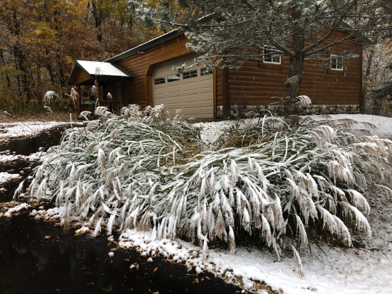 Ever one to playfully re-interpret reality, before Cyndie opened her eyes, I told her that it didn’t rain overnight like we had expected. The early dose of measurable snowfall made about the same impression on our Japanese silver grass as it did on us.