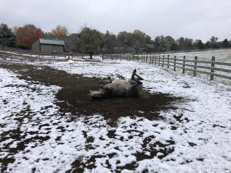 They have gained weight as hoped. We’ve been giving Mix an extra serving of feed pellets per day and we will begin doing the same with Mia to keep them on track toward a goal of optimal robustness. Mia, especially, could use a bit more body fat to cope at this time of year. She was pretty shivery at the start of the day. We are going to get a moisture-wicking blanket for her to help during these in-between weeks of cold precipitation.