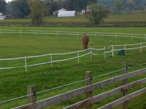After breakfast, as we wandered down the driveway toward our first project of the day, we found Cayenne all by herself in the middle of the arena, looking guilty as hell while trying to project an aura of innocence. What was most shocking about it was that the web fence was perfectly intact and the access closed.