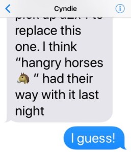 Cyndie moved the horses into the barn before the wild weather ultimately let loose, but she did have one interesting anecdote to share from a little earlier.