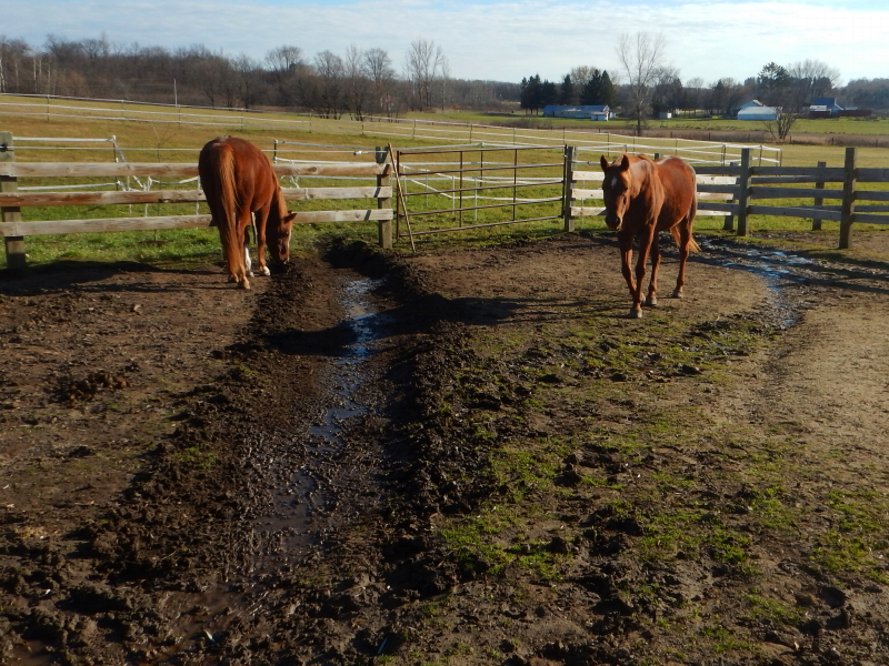 Before all that sloppy snow fell yesterday, I spent some time on Friday refining a drainage path in the paddock. The horses took immediate interest, more so because I was working near a gate they hoped I would open. I had no intention of giving them access to graze in the arena at the time, but they eventually charmed me into allowing it.