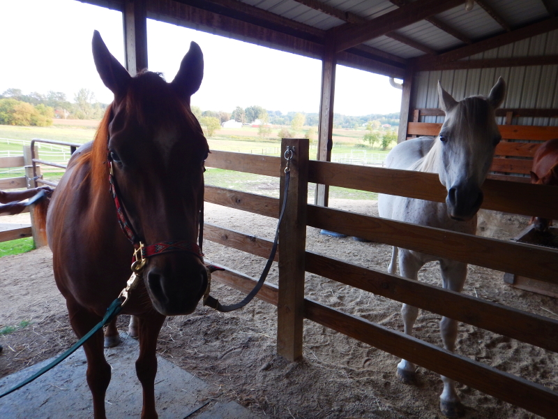 We did the usual perimeter trek at a leisurely pace, returning to the point we had started from near the house. Delilah was ready to rush back indoors, but I wanted more. I dropped off my extra shirt, because it was more than I needed, and took Delilah down to the pasture so I could spend some time with the horses.