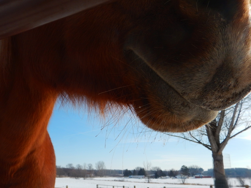 We have been experiencing a string of below zero (F) overnight lows the last few days, but since it wasn’t windy, we left the horses outside to deal with it. Cayenne was able to show off her awesome eyelashes with an icy white highlight in the morning during breakfast.