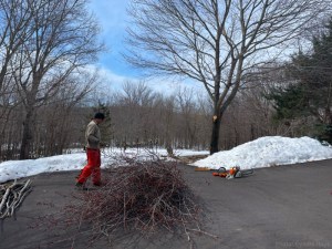 The weather was pleasant yesterday and enough snow had melted at the top of the driveway that I was able to cut up the branches of the big limb that came down in the last storm. That meant I needed to fire up the chainsaw that hasn’t seen any action in months. It was a little reluctant to start which involved enough pulling that I required a break to catch my breath but the second effort was the charm.