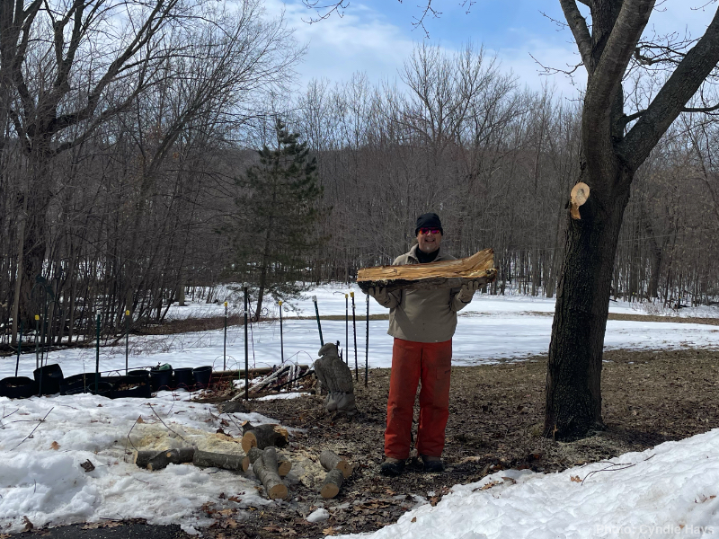 I cut up the fallen limb to three different levels: logs to split for firewood, branch trunks 4″ or less saved for the chipper, and branch tops to pile along our north property border. I trimmed the broken stump back to the main trunk of the tree and held it up for Cyndie like it was a trophy.