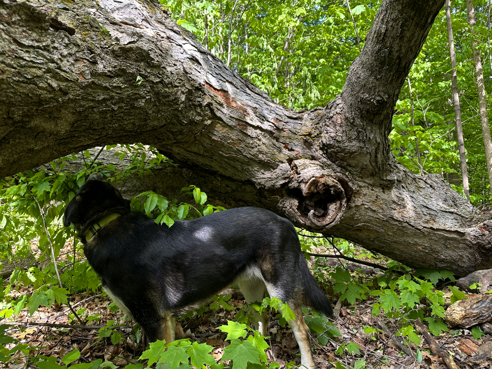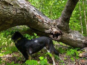 While I had the chainsaw out, we headed into the woods to remove the latest tree that had fallen across one of our trails. I also brought down a medium-sized tree leaning against others at a 45-degree angle. We keep adding to the dead wood lying on the ground in our forest because trees fall more often than we can consume the wood.