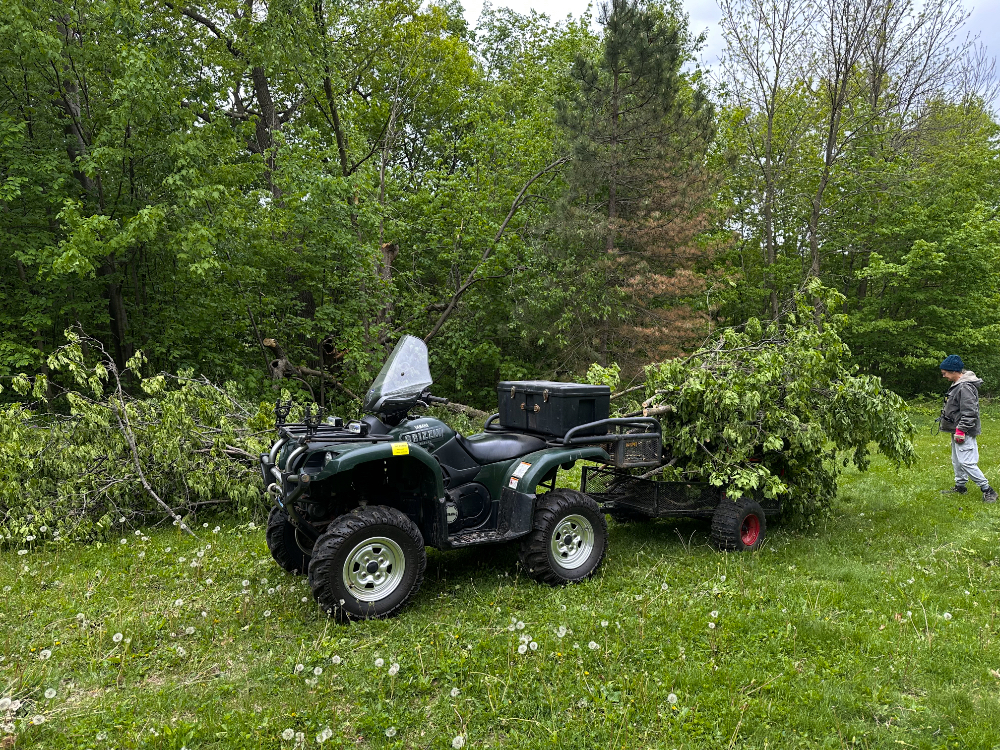 Put gas in the chainsaw three times. Hauled six trailer-loads of branches away. I wouldn’t call the project done, but we made a respectable dent in the big maple tree clean-up, and we have it to a point where everything can just sit for a while, allowing us to direct our attention to more pressing needs for a few days.